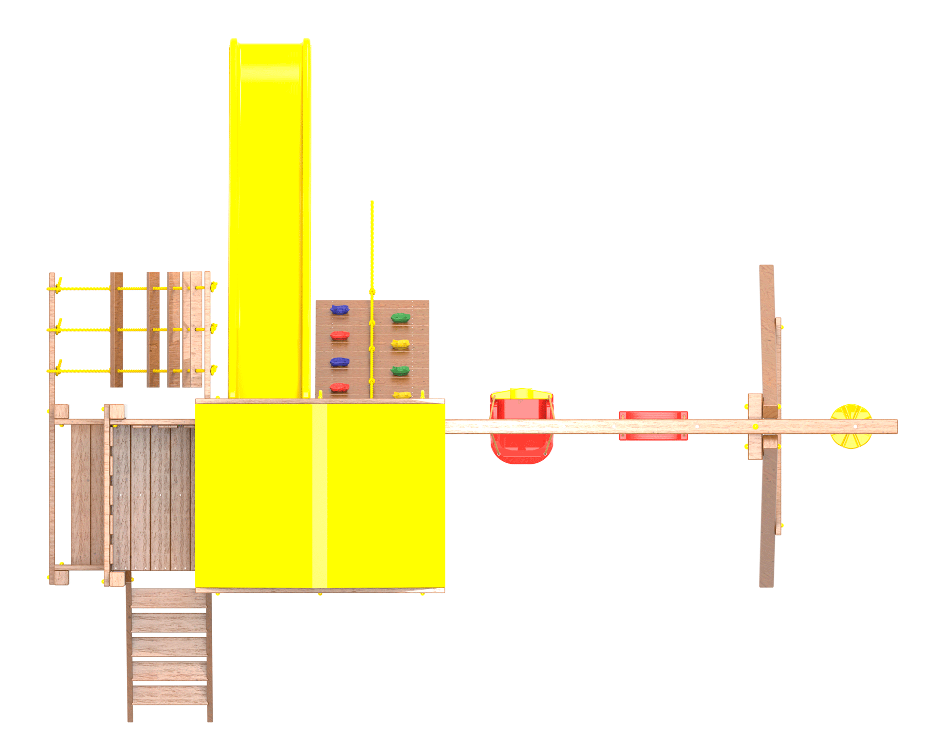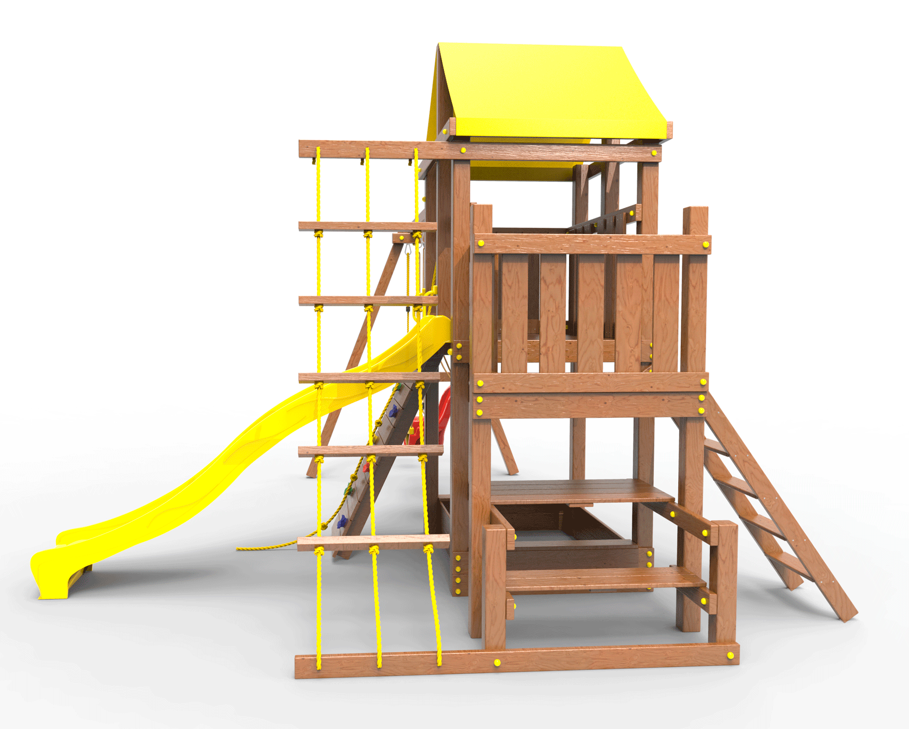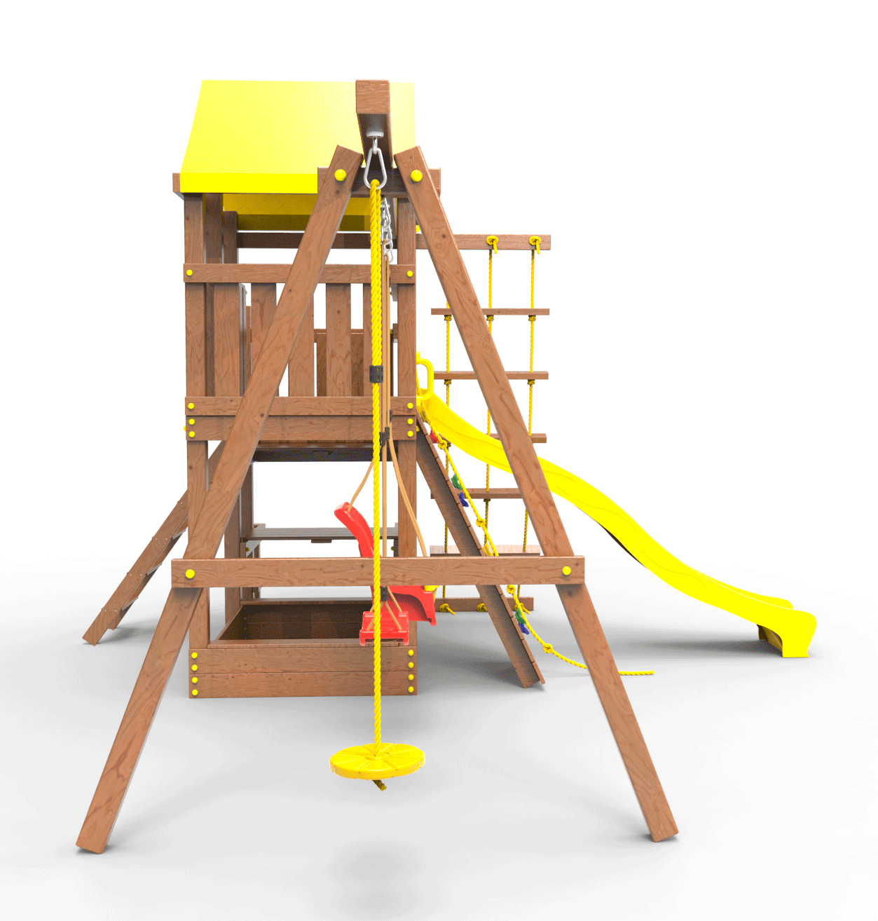 ● деревянная крыша ● трап 2м с канатом ● поручни для лестницы ● диван на цепях двухместный ● столик в песочницу