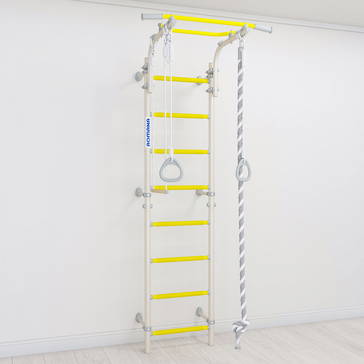 Одно из важных преимуществ этого ДСК - регулируемый турник, который фиксируется надежными хомутами. Его можно установить на лестнице на любую высоту. В зависимости от возраста ребенка, турник можно перевесить повыше или пониже.
