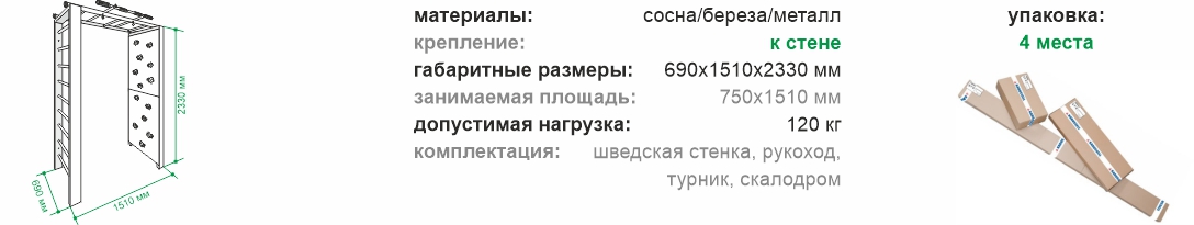 Включает в себя шведскую стенку с одной стороны и скалодромом с другой стороны соединенных между собой рукоходом с турником.