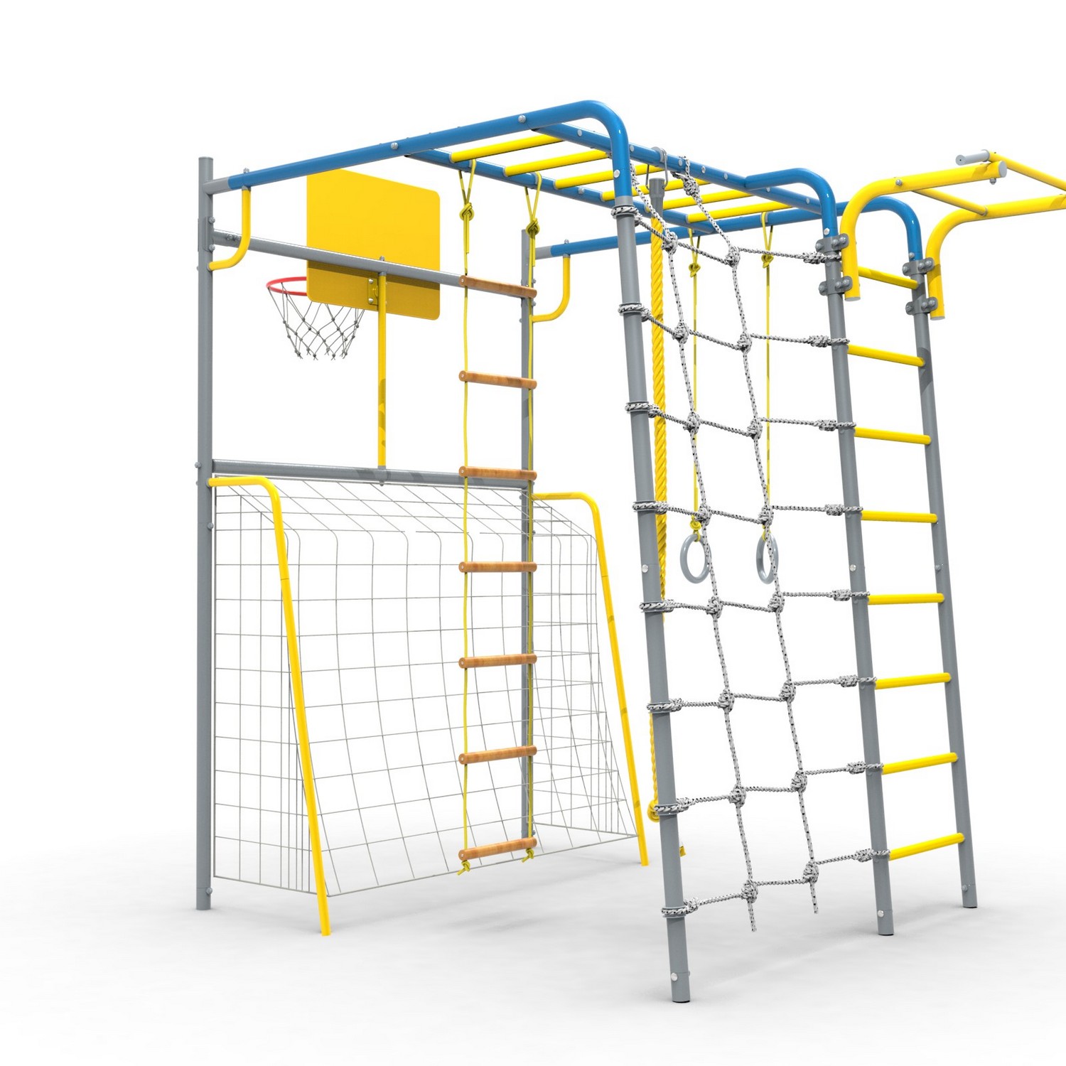 - Комплектация Ворота, сетка для лазания, кольца гимнастические, канат, кольцо баскетбольное, лестница веревочная, турник (регулируемый по высоте), рукоход, ступени ПВХ